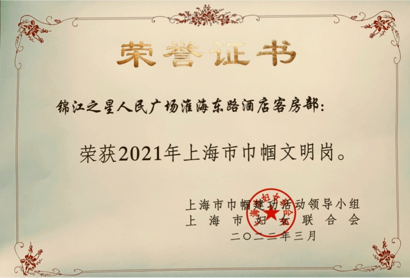 2022年3月,锦江之星人民广场淮海东路酒店客房部荣获2021年上海市巾帼文明岗。