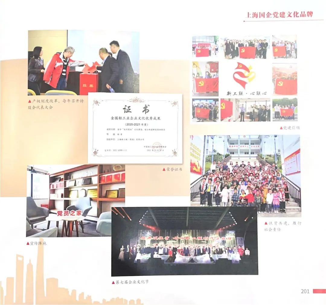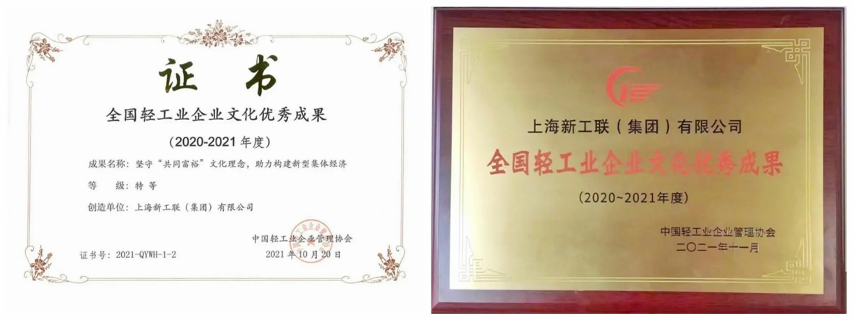 在党建引领下,具有新型城镇集体经济特色的企业文化,分别荣获了 2020-2021年度“全国企业文化优秀成果二等奖”“中国轻工业文化建设特等奖”。