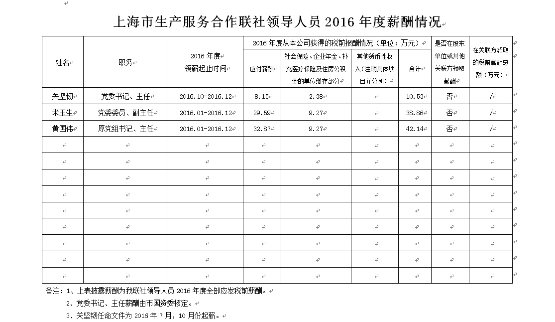 上海市生产服务合作联社领导人员2016年度薪酬情况
