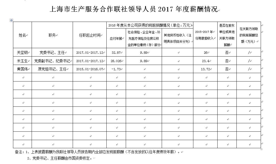 上海市生产服务合作联社领导人员2017年度薪酬情况